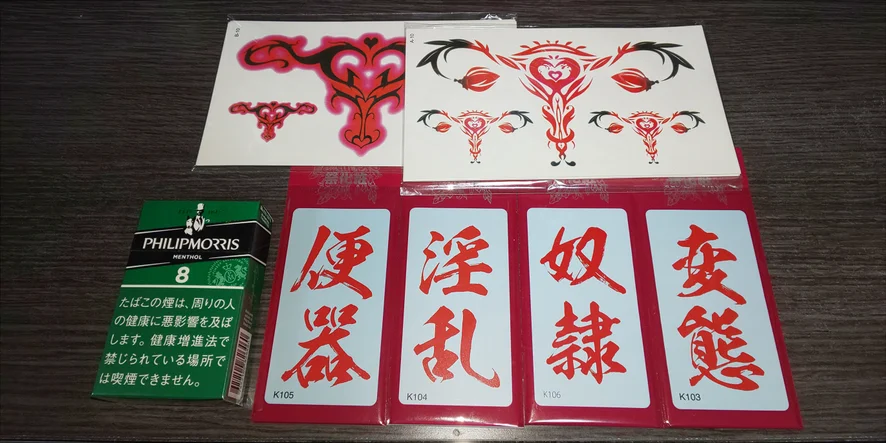 I bought the following tattoo stickers. Lewd crest(20 sheets), Urinal, Lewd, Slave, Pervert
